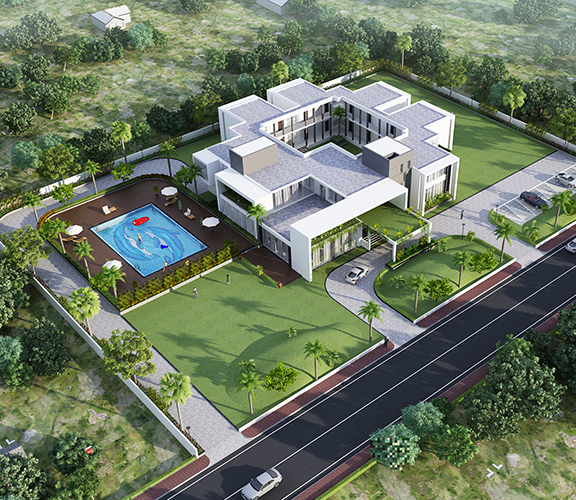 A Sprawling bungalow rising from the greens, the orchards. Design revo