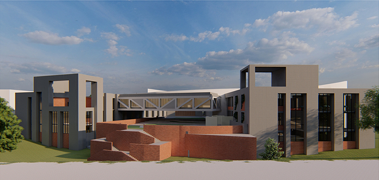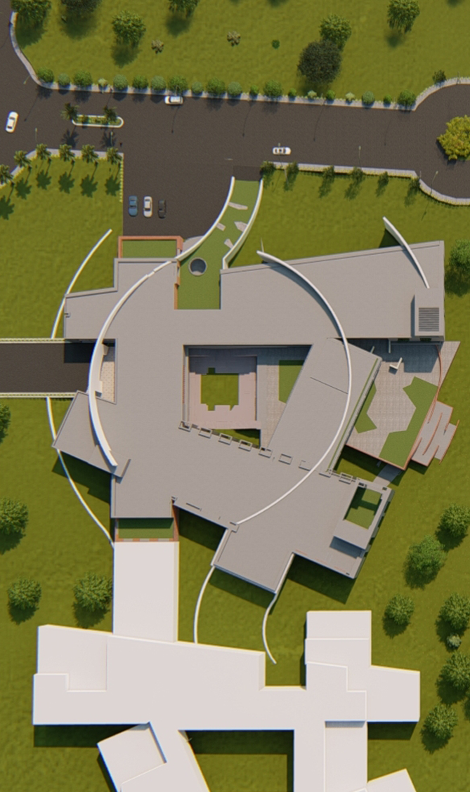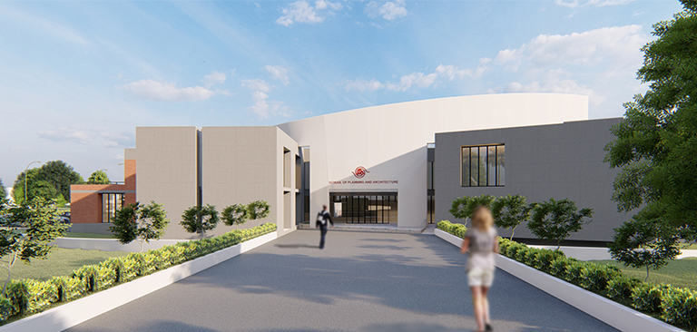 The Campus of School and planning and architecture Bhopal is located in the outskirts of the city. Bhopal has a strong architectural influence. Be it Sanchi stupa- a very prominent example of Buddhist architecture or Taj-UL Masjid from the Mughal Architecture. The Building form has a strong sense of Building core through a central courtyard and also a strong means of Periphery, influenced by the famous Sanchi Stupa. The form is simple yet dynamic and powerful. The form integrates within it abstractly the qualities of expansion, open endedness, dynamism while responding perfectly to the topography and climatic conditions.
